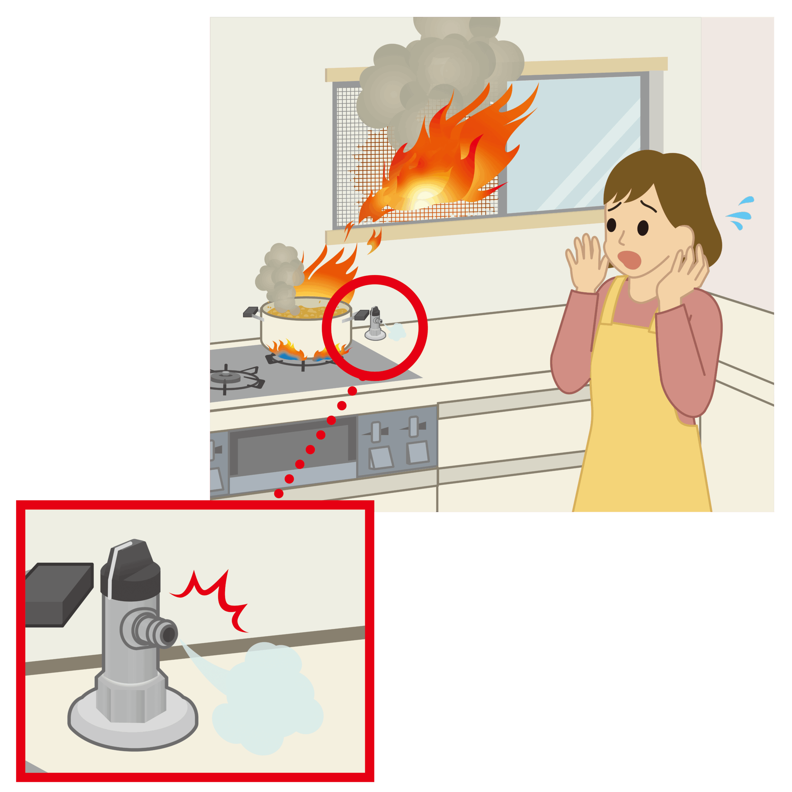 事故発生の3日前にリフォームでビルトインコンロに交換したが、テーブルコンロに接続されていた未接続のヒューズガス栓が半開状態でガスが漏えい。コンロ点⽕時に引⽕して網戸が炎上し延焼した。