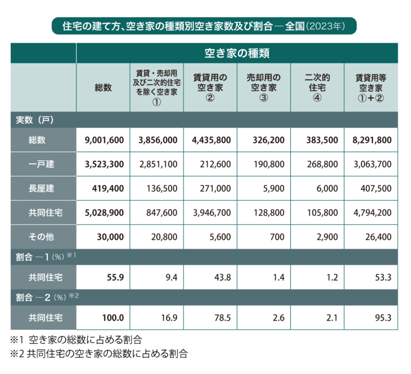 近年の空き家問題は、地方の一部に限った話ではありません。総務省の令和5年住宅・土地統計調査では、全国の空き家総数は約900万戸に達しています。その内訳を見ると、共同住宅の空き家が約503万戸で全体の55.9%を占める一方、一戸建ても約352万戸あります。