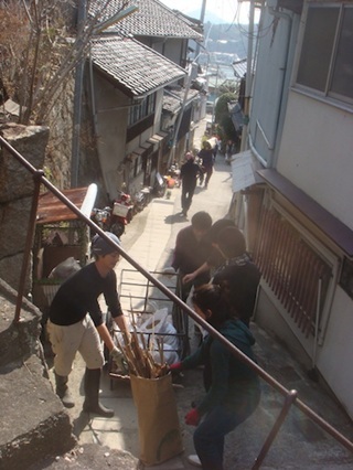 車が入れない尾道の坂道では、資材の搬入も人力。再生の現場は、こうした急坂の上にある